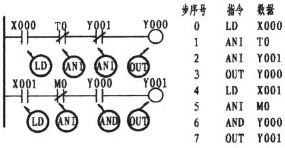 由第1梯級來看;X000、T0、Y001三觸點(diǎn)成串聯(lián)關(guān)系,即T0的常閉串接于X000的后端,而Y001的常閉則串接于T0常閉的后端。由于都是常閉故用ANI指令。現(xiàn)來看第2梯級;X000、M0、Y001,同樣三觸點(diǎn)也是串聯(lián)關(guān)系,M0的常閉接點(diǎn)串接于X001的后端,而Y000的常開接點(diǎn)則串接于M0的后端。故M0的指令用ANI,而Y000的指令則用AND(具體編程詳上圖),一句話只要是串聯(lián)后面是常開的用AND,是常閉的則用ANI。可使用AND、ANI指令元件有:輸入繼電器X、輸出繼電器Y、輔助繼電器M、定時(shí)器T、計(jì)數(shù)器C、狀態(tài)繼電器S。