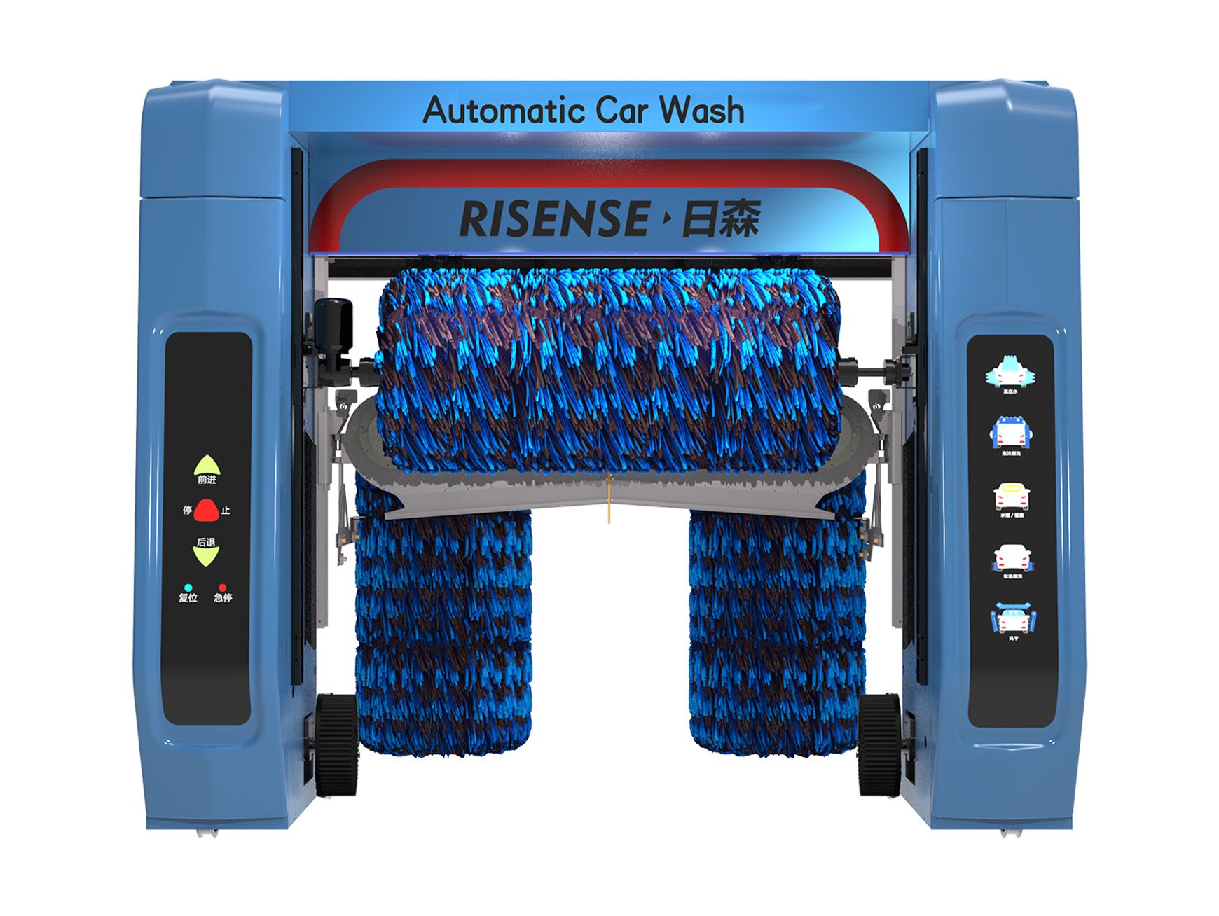 五刷往復式洗車機、泡沫洗、水蠟洗、4風機風干。可搭配智能自助系統,實現無人值守智能洗車。